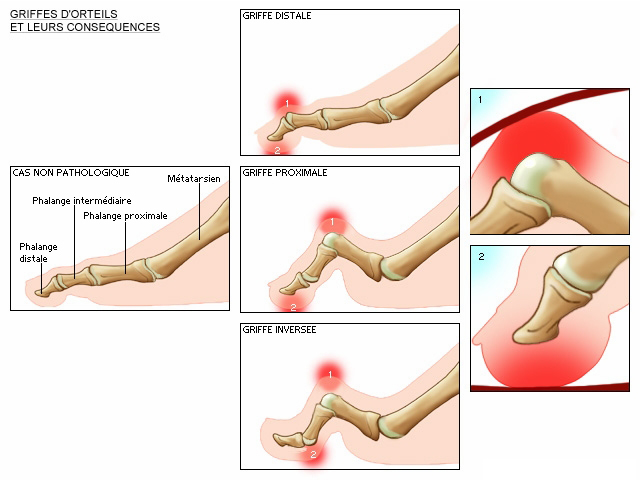 Les griffes sont invalidantes par le conflit au chaussage, générateurs de cors parfois très douloureux. De plus, il faut savoir que les griffes majorent ou provoquent des métatarsalgies (douleurs sous l'avant-pied) en augmentant l’appui sur la tête métatarsienne correspondante.